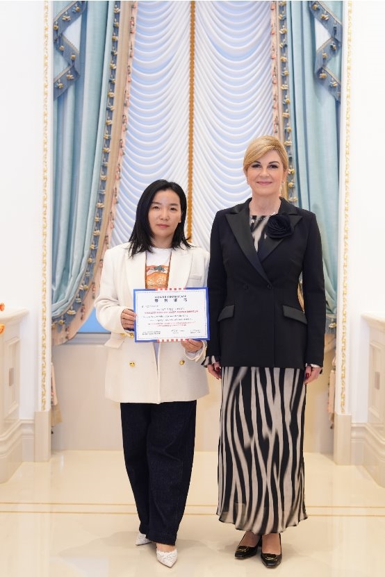 活动现场科琳达总统亲自为鸾玺堂中医诊所与舒美尤品牌颁发克罗地亚共和国第四任总统指定推荐品牌荣誉证书,并与钟亲嫚女士合影留念。