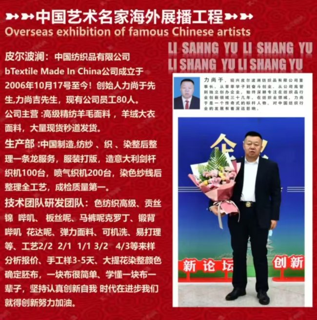 经纬之间藏匠心,一针一线筑华章。力尚于以三十余载的坚守与创新,在纺织行业书写了新时代企业家的奋斗故事,也为传统产业转型升级提供了鲜活样本。未来,他将继续带领绍兴皮尔波澜纺织品有限公司,乘着两会东风,在高质量发展的道路上笃定前行,以纺织之笔绘就产业振兴、品牌强国的壮美画卷。